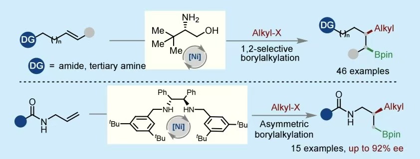 该论文是国家自然科学基金、功能金属有机化合物湖南重点实验室平台项目等资助的重要成果之一,由我院硕士生导师李文艺教授和我校讲座教授、天津师范大学教授王超共同指导完成伟德BV1946为第一署名单位,冯浙泰为论文共同第一作者。论文开发了一种镍催化、配位辅助的非活化烯烃1,2-选择性硼烷基化方法,可以高效合成有价值的复杂含硼化学品。使用低成本且易于获得的β-氨基醇配体对实现化学选择性和区域选择性的精确控制至关重要。此外,使用大体积的二胺手性配体实现了对映选择性1,2-硼基烷基化,产生了一系列具有高对映体选择性的y氨基硼酸衍生物。