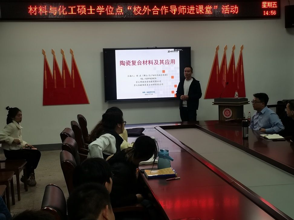 为了提高研究生的实践能力和就业竞争力,2023年11月24日下午,我院在化学楼105会议室召开“校外合作导师进学堂”活动,此次活动邀请校外企业导师胡庆博士作学术报告,报告题目为“陶瓷复合材料及其应用”。本次活动由孙俊彬副院长主持,许志锋院长,部分老师和全体研究生参加此次活动。