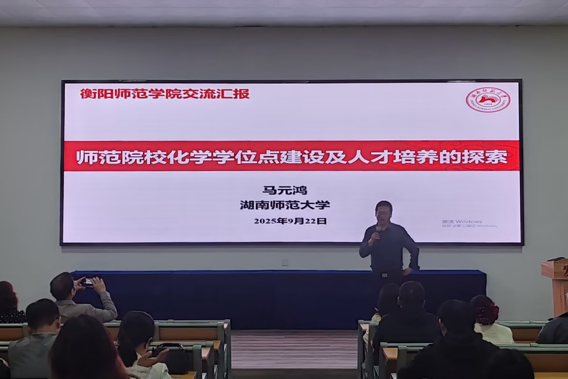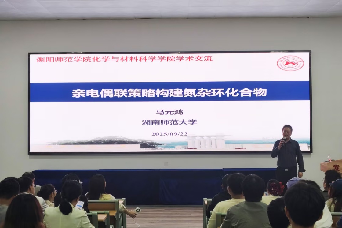2025年9月22日下午,湖南师范大学化学化工学院马元鸿教授应邀来访我院,在学奎楼104会议室分别作了题为“亲电偶联策略构建氮杂环化合物”与“师范院校化学学位点建设及人才培养的探索”两场专题报告。报告会由学院副院长李文艺教授主持,学院部分专任教师、全体硕士研究生及部分本科生代表参加。