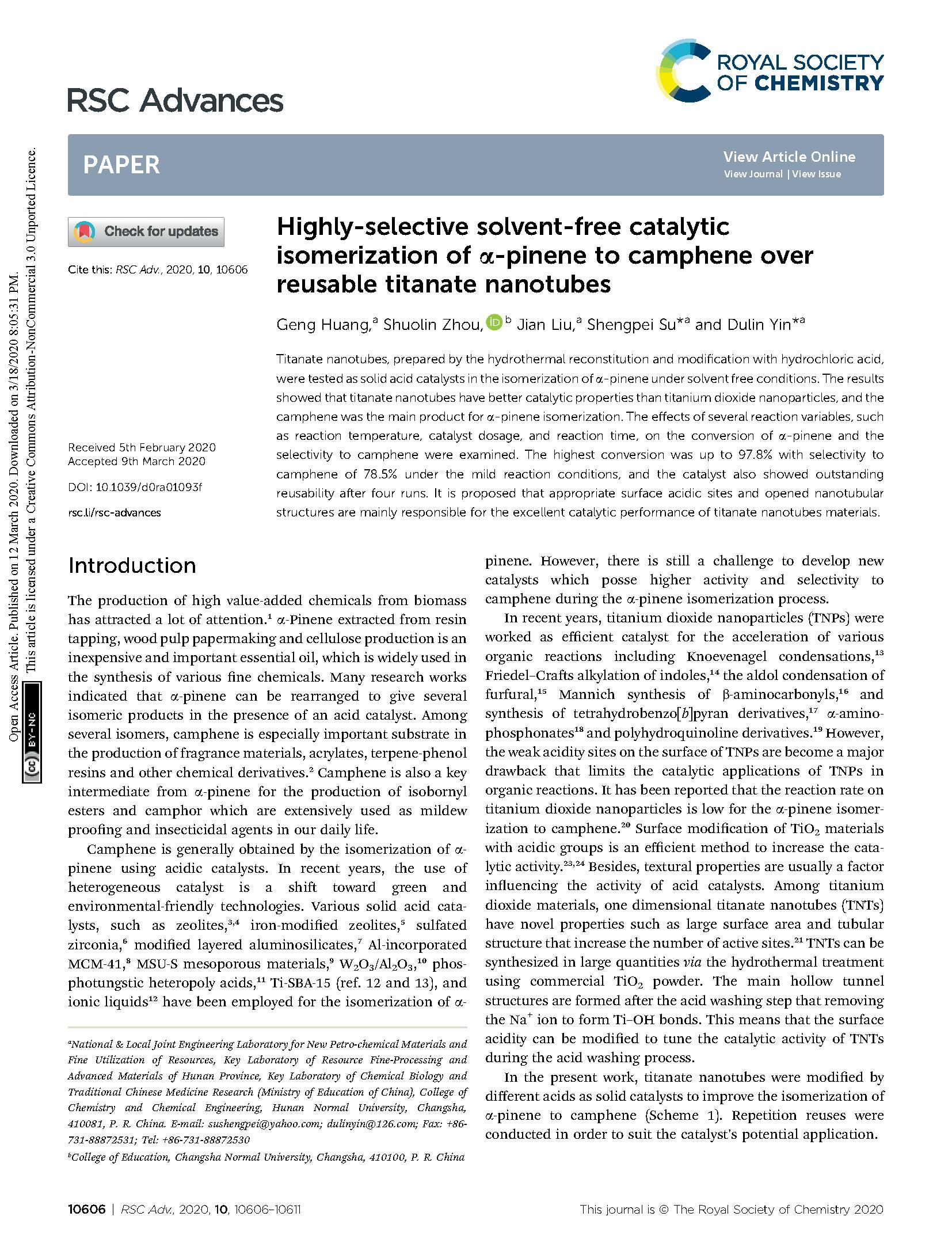 (5)Huang Geng, Zhou Shuo-Lin, Liu Jian, Su Sheng-Pei, Yin Du-Lin. Highly-selective Solvent-free Catalytic Isomerization of α-Pinene to Camphene over Reusable Titanate Nanotubes. RSC Advance, 2020, 10: 10606-10611.