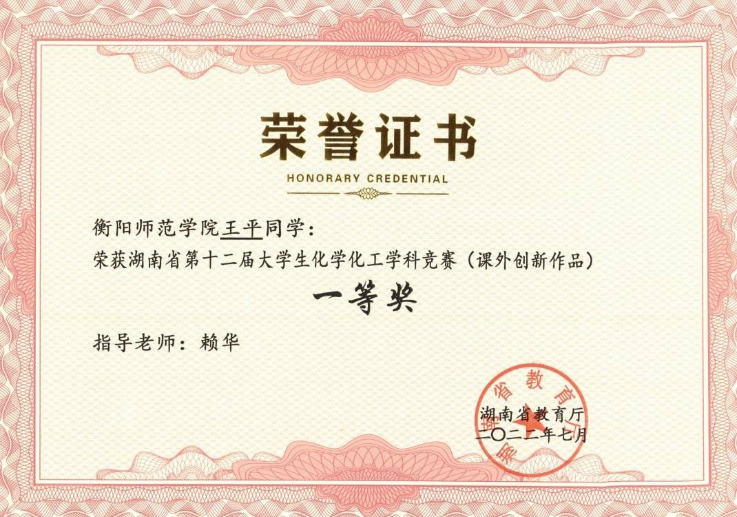 (3)湖南省教育厅重点项目:高活性溴代 D-π-A 有机染料的合成及制氢性能研究,项目编号:20A075,2021-2023.