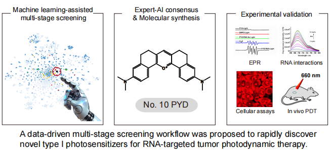 研究通过AI与专家协同的智能筛选范式首次将数据驱动模型与多阶段筛选结合,大幅缩短了光敏剂的开发周期。最终筛选的PYD光敏分子不仅能高效产生自由基,还可特异性靶向肿瘤RNA,为精准治疗提供新工具。该方法为其他难治性肿瘤的光敏剂开发提供了可复制的技术路线,有望加速下一代PDT药物的问世。该成果发表于《Chemical Science》,标志着AI辅助药物发现与肿瘤治疗领域的深度融合,为克服传统疗法的局限性开辟了新路径