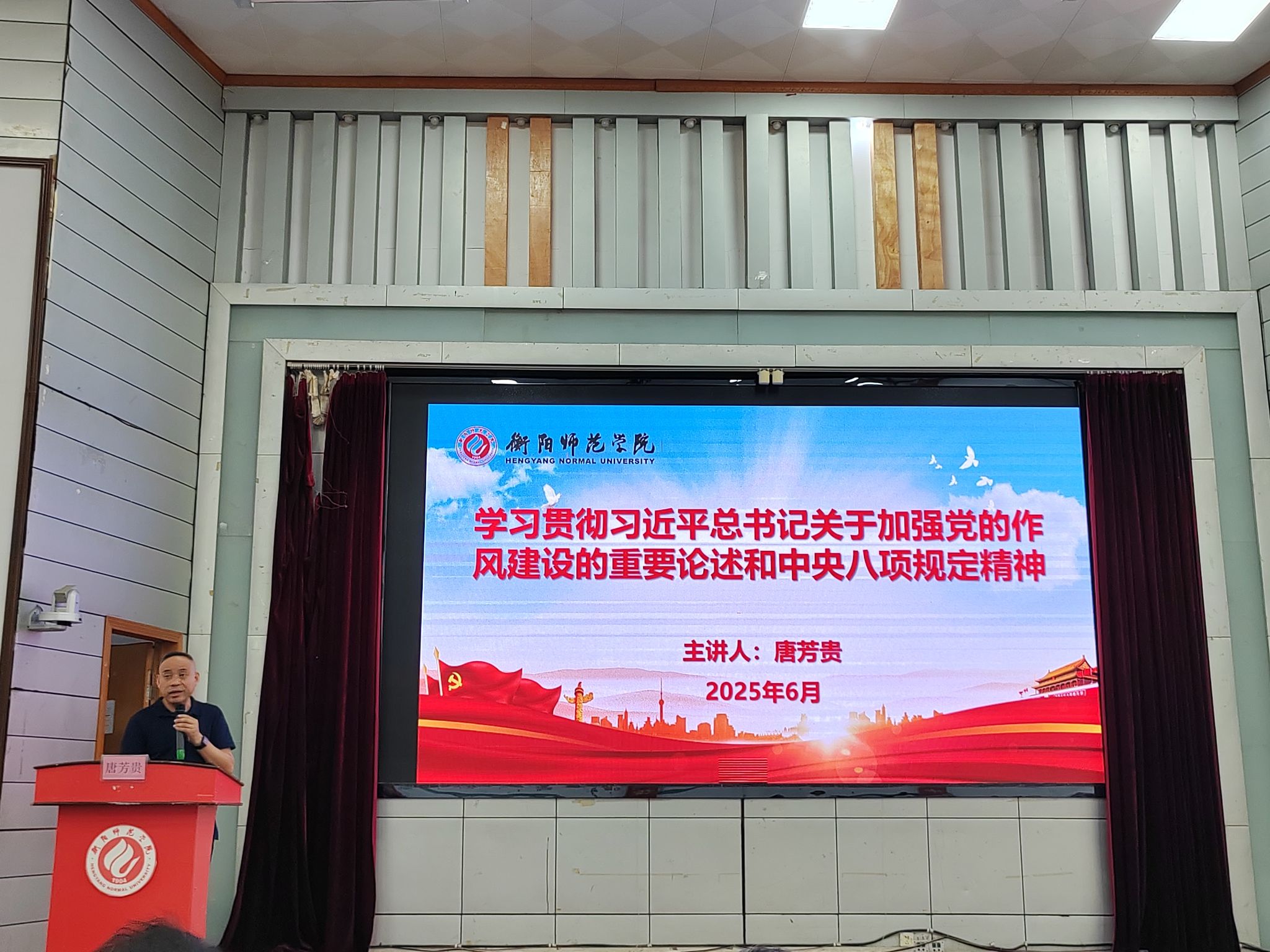 2025610日下午,我院与生命科学学院200名师生在西校区模拟法庭进行党的作风建设党课学习,担任本次党课主讲嘉宾是校党委委员、副校长唐芳贵教授,主讲题目为《学习贯彻习近平总书记关于加强党的作风建设的重要论述和中央八项规定精神》深刻阐释新时代作风建设的核心要义与实践路径