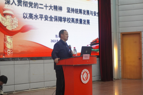 陈敏首先深刻阐述了当今严峻的国际形势,指出我们正处于向第二个百年奋斗目标的关键时期。为抵制外国敌对势力对我国的打压、保持我国的高速发展,我们必须坚持中国特色社会主义道路,积极学习党的二十大精神;在学什么这一方面,他重点阐述了二十大中的“统筹发展与安全”,强调“统筹发展与安全”的重要性,并结合国内近期发生的“内蒙古矿难事件”“长沙电信大楼火灾”“望城自建房倒塌”等惨重教训以及我校的具体案例,告诫我们在谋求发展的同时一定要保障安全,切实实践习近平总书记“人民至上”“生命至上”的重要指示精神,做好校园安全稳定工作;在怎么干这一方面,他借助二十大重要论述的实质、要义和精髓,结合我校实际情况,在意识形态领域、消防安全领域、食品安全领域、交通安全领域等方面深入分析了我们面临的风险、挑战和压力,提出了树牢“一个理念”、压实“两个责任”、守住“三个底线”、构建“四个体系”的具体思路及措施。