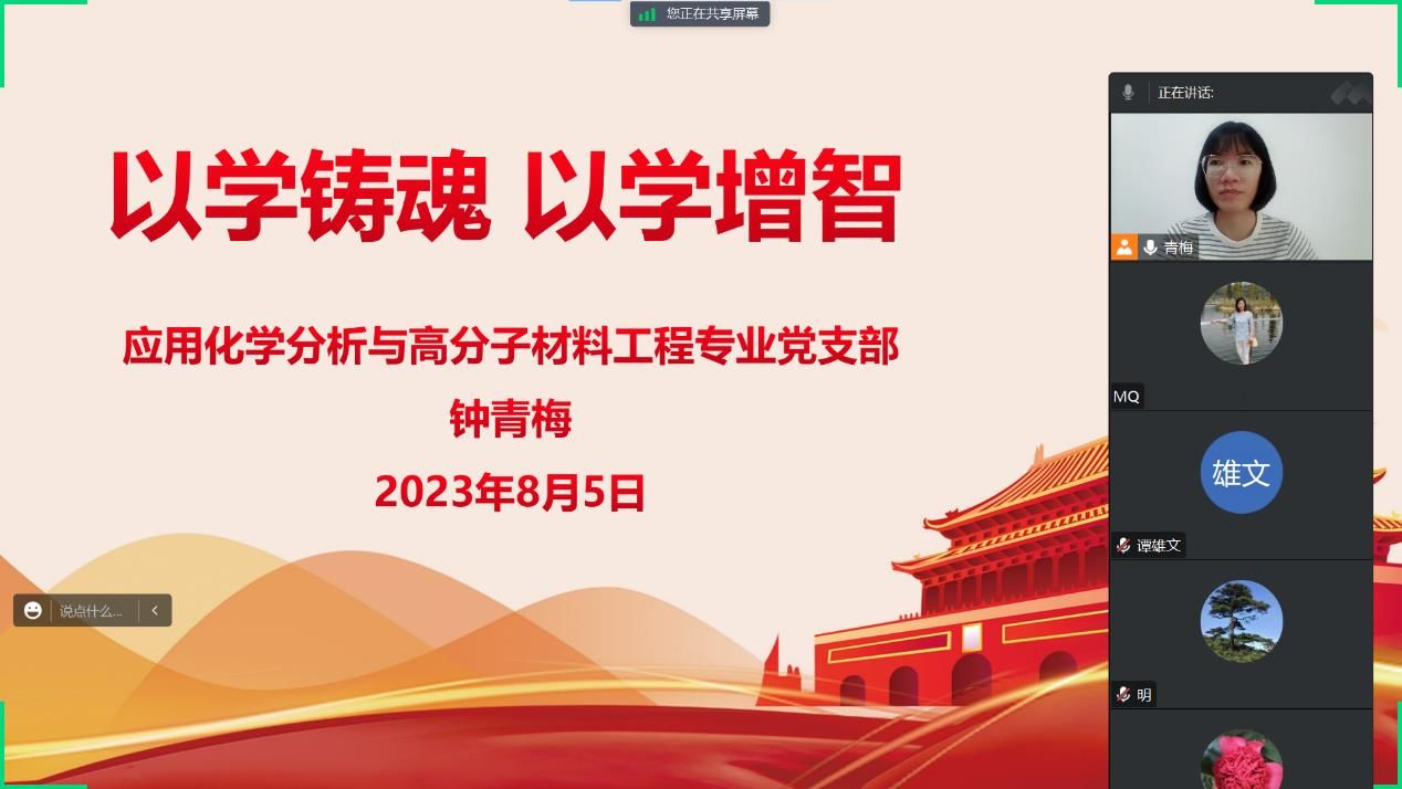 为深入开展学习贯彻习近平新时代中国特色社会主义思想主题教育,8月5日下午5点,我院应用化学分析与高分子材料工程专业党支部利用腾讯会议开展了题为《以学铸魂,以学增智》的线上微党课,党支部书记钟青梅主讲,支部成员全员参加。