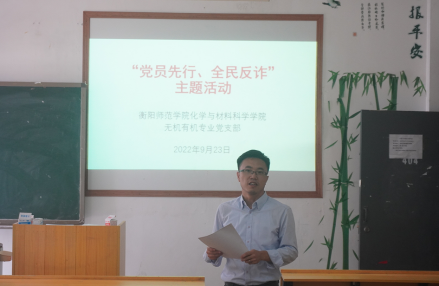 为迎接党的二十大胜利召开营造和谐稳定的社会环境,认真落实衡阳市委组织部《关于在全市基层党组织开展“党员先行、全民反诈”主题活动的通知》(衡组通〔2022〕31号)文件精神。衡阳师范学院1946伟德国际源自英国无机有机专业党支部于2022年9月23日中午12:30在综合实验楼404多媒体教室开展“党员先行、全民反诈”主题党日活动,全体支部党员参会,会议由党支部书记欧亚平主持。
