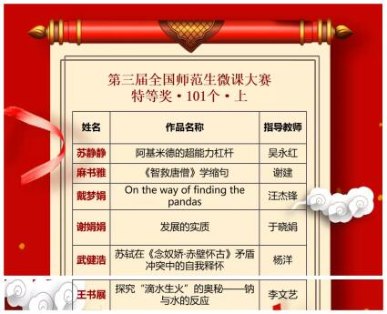 第三届全国师范生微课大赛历时半年,经院、校初赛、网络评审、专家评审,获奖名单最终揭晓,我院学子王书展凭借《探究“滴水生火”的奥秘——钠与水的反应》(指导教师李文艺),从众多参赛选手中脱颖而出,荣获特等奖,李文艺荣获优秀指导教师称号。