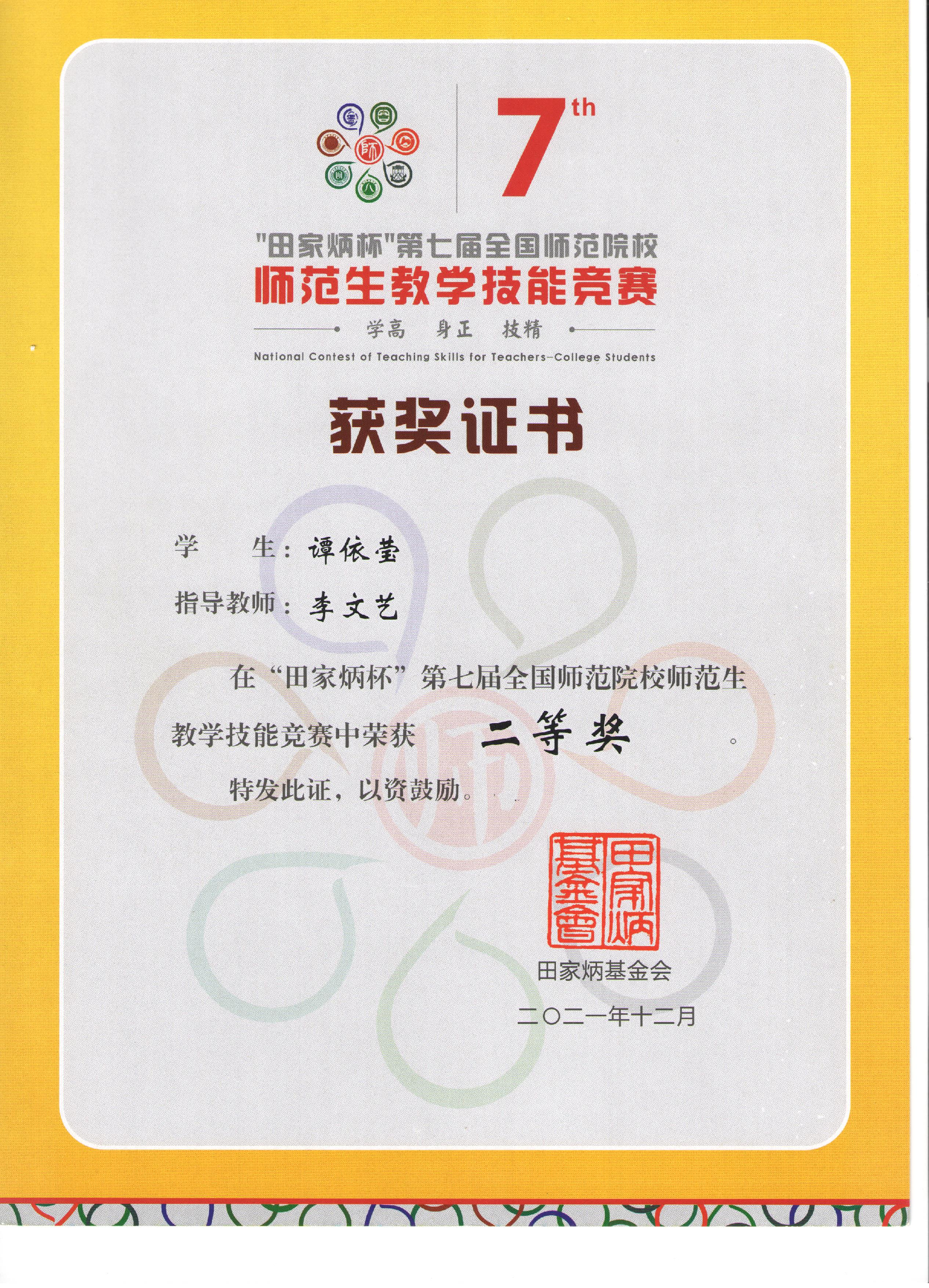 “田家炳杯”第七届全国师范院校师范生教学技能大赛由田家炳基金会和浙江师范大学共同主办,大赛分为语文、数学、英语、化学、生物、物理六个组别,每个院校每个组别只能推荐一名选手参加。我院学子谭依莹(指导教师李文艺)从初赛到复赛一路过关斩将,最终荣获二等奖。