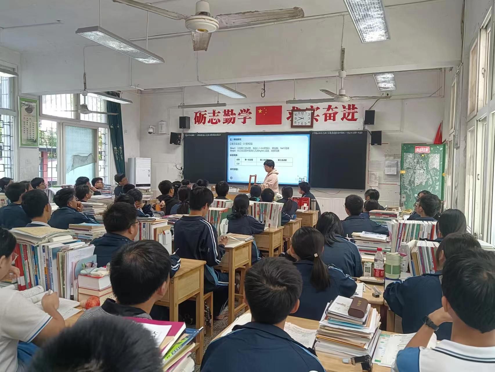 听课环节,实习生陈镜娇主讲了《氯及其化合物》一课,内容充实、条理清晰、组织得体,且教态自然、轻车熟路,充分展示了实习队近一个月来的实习成果,给听课领导、老师留下了深刻的印象。评课会上,衡东一中副校长秦强辉、院长许志锋、书记刘梦琴以及我校教学督导张复兴教授等人先后对授课内容、难重点把握、互动环节、实验操作等具体问题进行了深入、细致的点评,表扬了优点,肯定了成绩,尤其对课堂上存在的不足进行了详细讲解,提出了改进意见,给实习学生上了一堂生动的教学范例课。