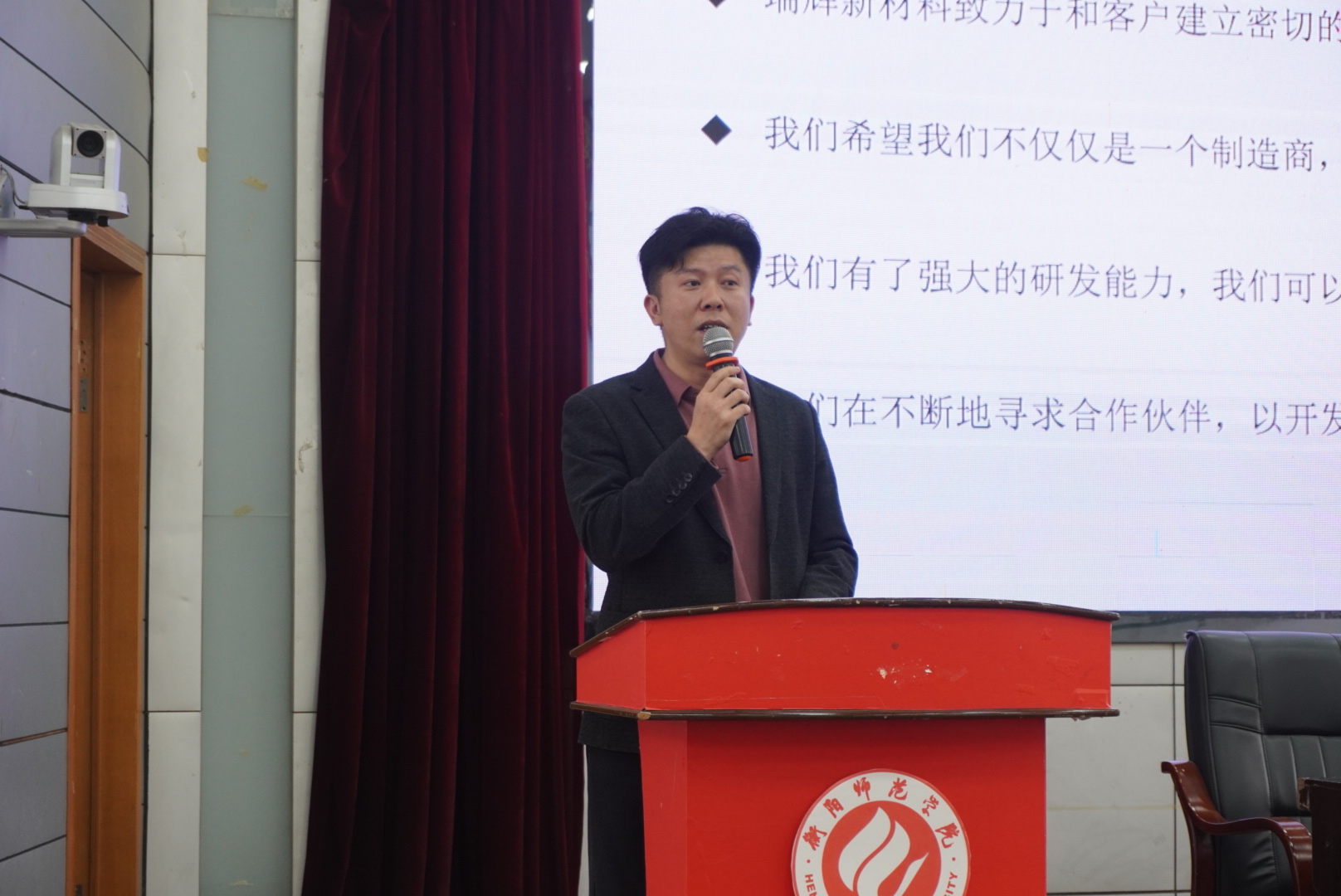 在毕业生就业动员大会之后,东莞瑞辉新材料技术有限公司总经理许鹏飞进行了现场招聘宣讲。他首先以学长的身份向毕业生们分享了自身求职经验,又以用人单位的身份从公司研发方向、公司环境、人才招聘、薪资待遇等方面进行了简要介绍。他列举了公司优秀员工的案例,鼓励应届毕业生要肯学、肯思、肯干,只有脚踏实地,处世稳重,虑事周全才能受用人单位青睐。随后,他为毕业生们进行了现场答疑解惑。