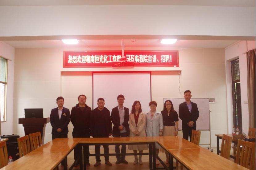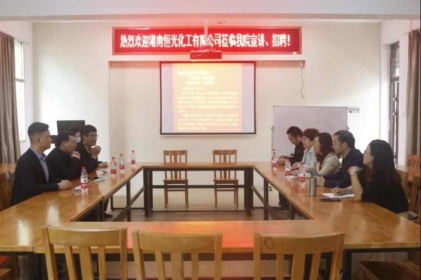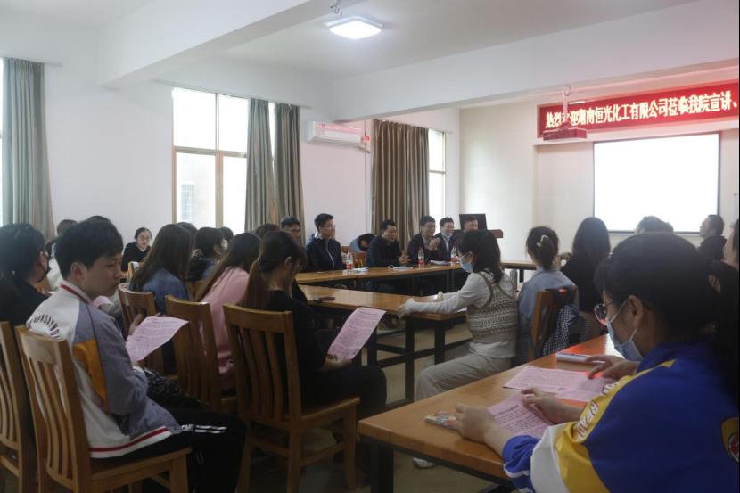 2022年4月22日下午三点,为了给学生提供就业机会,我院特邀请湖南恒光化工有限公司到校举办校园宣讲招聘活动,宣讲招聘会在成教楼405会议室进行,出席此次活动的嘉宾由湖南恒光化工有限公司总经理陈建国带队,我院党政领导刘梦琴、许志锋、曾玖红、付伟伟、李文艺全部参加,部分毕业生现场咨询、应聘。