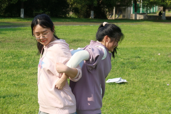 活动通过开场的热身小游戏——“击鼓传花”来完成队伍分配,游戏中的才艺表演环节让足球场充满欢声笑语。最考验院干们团队意识的便是“党史知识竞答”环节,该环节共分为三个赛区,第一个赛区的队员吹起气球,以背靠背的方式夹住气球运送到下一赛区。第二赛区的两名队员接过气球,用胸口夹住将其送往第三赛区。最后一个赛区的队员用腿夹住气球,采用双腿跳的方式将气球运送到终点并将其压爆后,即可进行党史知识竞答。此外,“以小见大”和“突破重围”两个游戏环节也大大增强了院干之间的沟通交流和团队凝聚力。活动中,尽管有些队伍排名落后,但他们不畏强手、奋力拼搏,为团队荣誉而战的精神和担当值得大家点赞。