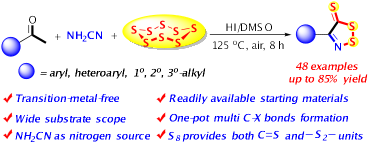 1,2,3-二噻唑-5-硫酮类化合物因其独特的生物活性成为药物化学领域的研究热点。该工作开发了一类无金属催化条件下,以简单易得的甲基酮、单质硫和氰胺为原料,多组分高效合成1,2,3-二噻唑-5-硫酮化合物的新方法。机理研究表明,反应依次经历Kornblum氧化、脱水缩合、Willgerodt-Kindler多硫化及杂环化过程。其中单质硫作为三硫供体,同时提供C=S与–S₂–单元。氰胺与甲基酮原位缩合,避免了含氮前体的预制备,在HI/DMSO作用下“一步”实现三个Csp³-H键的断裂和多个C-杂键的构建。该方法为1,2,3-二噻唑-5-硫酮的合成提供简洁、高效的新路径,具有操作简便、原子经济性高等优势。