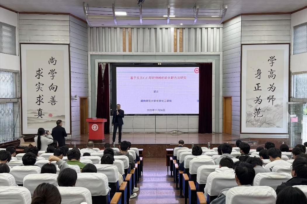 为营造浓厚学术氛围,拓展师生科研视野,2025年11月6日下午,湖南师范大学化学化工学院梁云教授应邀来我院开展学术交流,在西校区模拟法庭作了题为《基于五元C,C-环钯物种的转化新方法研究》的精彩报告。报告会由学院副院长李文艺教授主持,学院部分专任教师、全体硕士研究生及部分本科生代表共同参加。