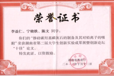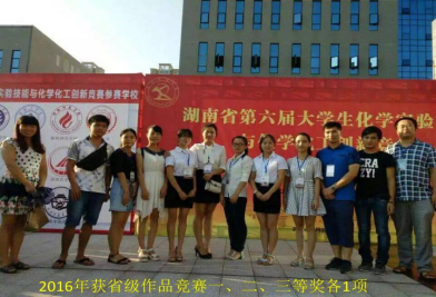 代表性成果如“力诺瑞特杯”第十四届大学生节能减排社会实践与科技竞赛全国三等奖、“微瑞杯”第二届全国大学生化学实验创新设计大赛华南赛区二等奖、第十二届“挑战杯”湖南省大学生创业计划竞赛铜奖、第十二届“挑战杯”湖南省大学生创业计划竞赛网络人气项目、第九届“挑战杯”湖南省大学生创业计划竞赛银奖、第五届“互联网”大学生创新创业大赛一等奖、第六届“互联网+”大学生创新创业大赛银奖、湖南省第六届化学实验技能与化学化工创新竞赛一等奖、湖南省第六届化学实验技能与化学化工创新竞赛二等奖、第八届湖南省大学生课外化学化工创新作品竞赛、湖南省第二届大学生创新实验成果展暨创新论坛“十佳”论文奖,国内外发明专利如《Soil Remediation Passivation Microcapsule》和《Fabrics for autocatalytic sewage treatment》、《一种氨基碳羟基磷灰石复合材料及其制备方法和应用》、《一种土壤钝化修复剂及其制备方法》、《一种污水处理用网布及制备方法》等。