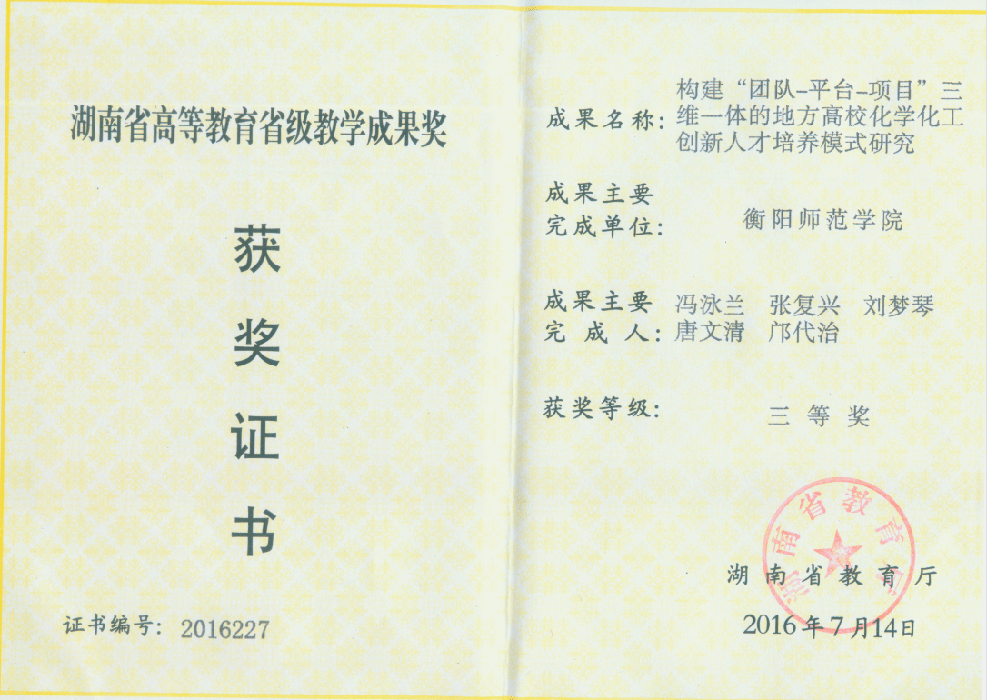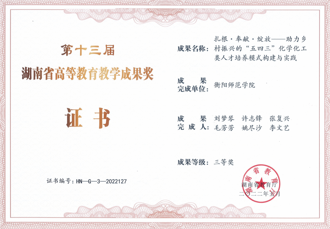 ③教学改革成果丰硕。发表教研论文64篇,主(副)编教材7部,编写校本教材特色鲜明,10多所地方高校广泛使用。2010年与湘谭大学、湖南工程学院合编《有机化学实验》,2014年与韶关学院、肇庆学院等合编《分析化学》,教材多次再版,反响良好。新增省级一流专业2个、省级一流课程4门,2016年和2022年分别获得湖南省教学成果三等奖。
