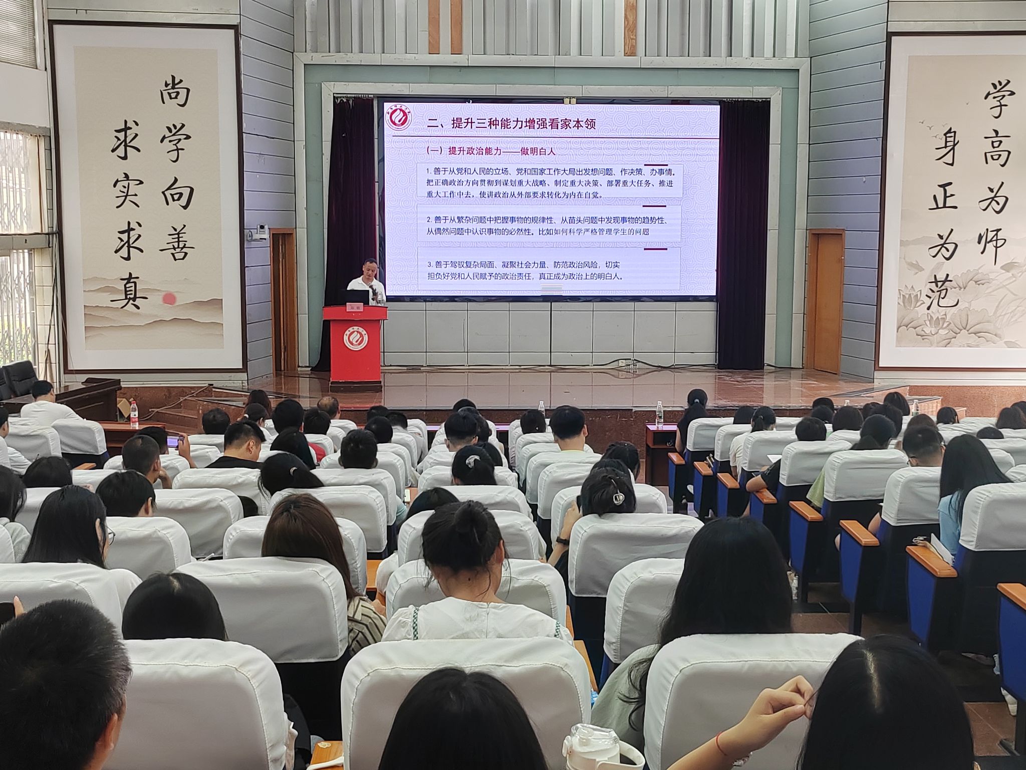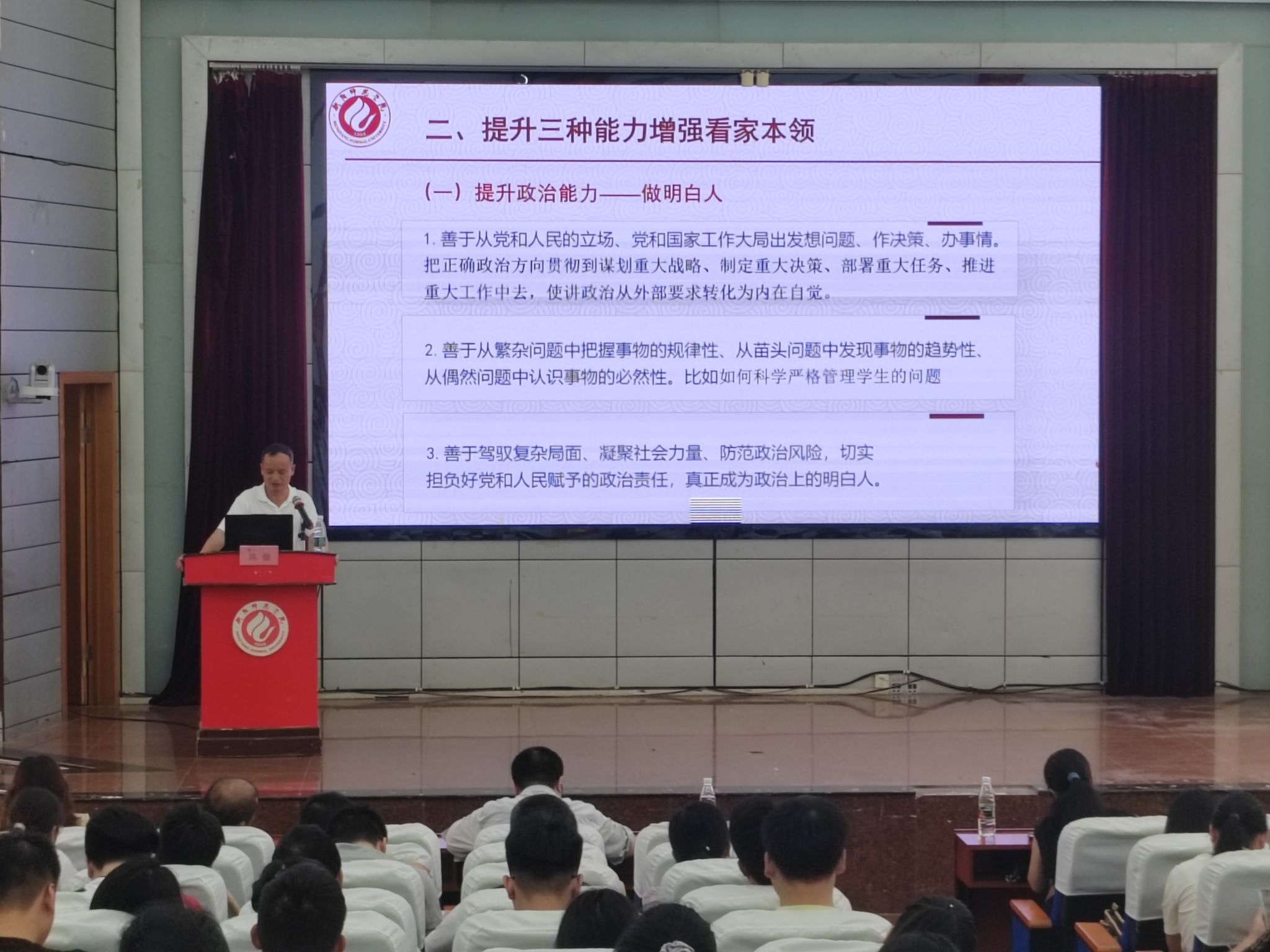 党课分三个部分:(一)科学认识和准确把握教育的本质。陈敏阐述了目前我国国内外的政治环境,提出了教育的首要问题,即为谁培养人、培养什么人、怎样培养人,指出教育的本质是立德树人,教师不仅仅是传授知识,更重要的是塑造灵魂,决不能培养出“长着中国脸,不是中国心,没有中国情,缺少中国味”的人。陈敏强调,中国的教育,要扎根中国大地办教育,必须传承中国传统文化、掌握中国历史、面向中国未来,只有这样,才能办好中国教育;(二)提升三种能力,增强看家本领。陈敏指出,首先要提升政治能力,做明白人。要从党和人民的立场、国家大局出发想问题、办事情,要善于从繁杂问题中把握事物的规律性、从偶然事件中认识事物的必然性。其次,提升思维能力,做智慧人。以六个必须坚持为原则,即人民至上、自信自立、守正创新、问题导向、系统观念、胸怀天下,在具体工作中善于把握事物本质,增强工作科学性,善于把握发展规律,增强工作预见性,善于把握工作关键,增强工作主动性。最后,提升实践能力,做能干人。学习最终目的是提高自身素质和能力,要在实际工作中,充分发挥出自身潜力,把工作做细、做实、做完美;(三)遵守“五律”,守正创新。即把握规律、遵守法律、服从纪律、接受他律、强化自律,各方面严格要求自己,自珍自省,沉下心来学、静下心来悟,补足精神之钙、把稳思想之舵,筑牢依法治校之基、做到学思用贯通、知信行统一,全面促进、推动学校高质量发展。