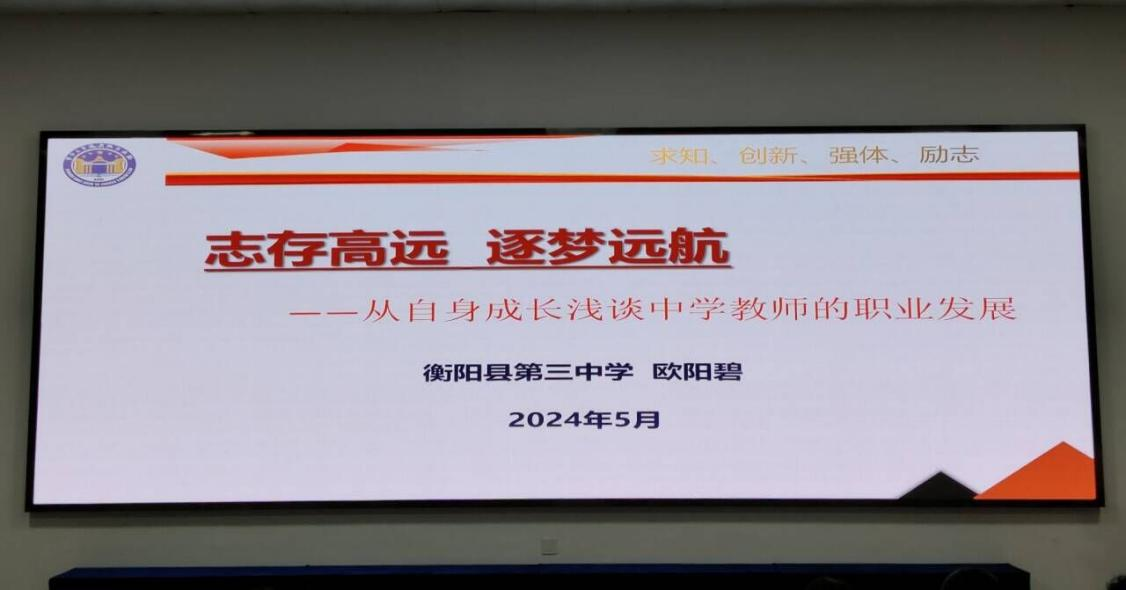 欧阳碧校长以“志存高远,筑梦远航——从自身成长浅谈中学教师的职业发展”为主题展开讲座。首先,他向大家介绍了衡阳县三中筚路蓝缕的发展历史,告诉同学们个人的成长发展、前进路上的崎岖不平,都需要艰苦奋斗的意志来踏平。接着,他以自身成长的经历告诉大家着眼长远,打牢基础,把行动交给现在,把结果交给时间。会场上,欧阳碧校长着重讲解了中学教师的职业素养和职业规划。他自豪地告诉大家,教师是太阳底下最光辉的职业,是一种幸福的职业,同学们要做符合“思想意识”、“核心素养”、“专业责任”、“行动要求”的高素质教师。随后,关于如何做一个好班主任的问题,欧阳校长分享了自己的感悟:首先要以问题为中心,实现知识问题化、问题情景化、情景生活化的转化;其次,要以学生为主体,以思维为主线,激发学生本能,发展学生学科素养;最后要立德树人,彰显生命力量。