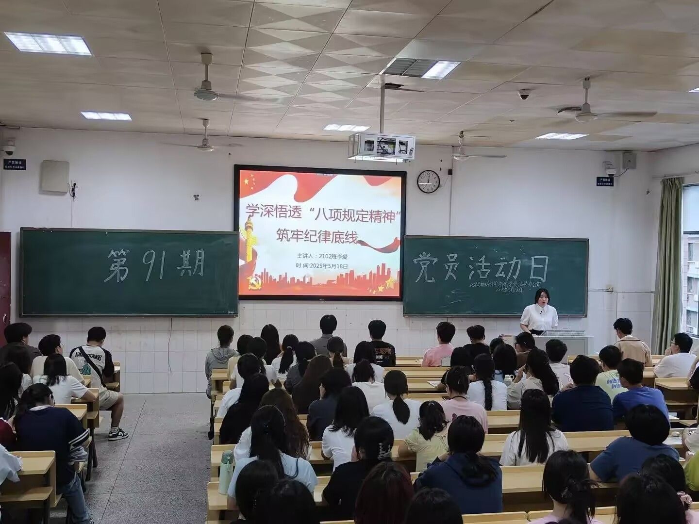 2025年5月18日晚,第91期党员学习日活动于行知楼601开展,2102班李爱同学以《学深悟透八项规定精神,筑牢纪律底线》为题与全体学生党员、入党积极分子分享了自己的学习心得。