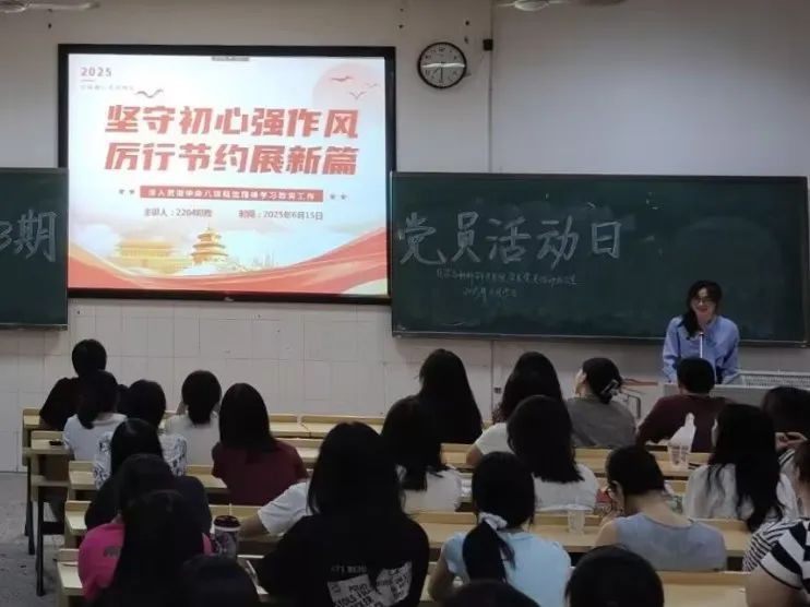 2025年6月15日晚,1946伟德国际源自英国第九十三期党员学习日活动于行知楼601开展,2204班邓煦同学以《坚守初心强作风厉行节约展新篇——深入学习贯彻作风建设重要政策精神》为题与全体学生党员和学习积极分子分享了她的学习心得。
