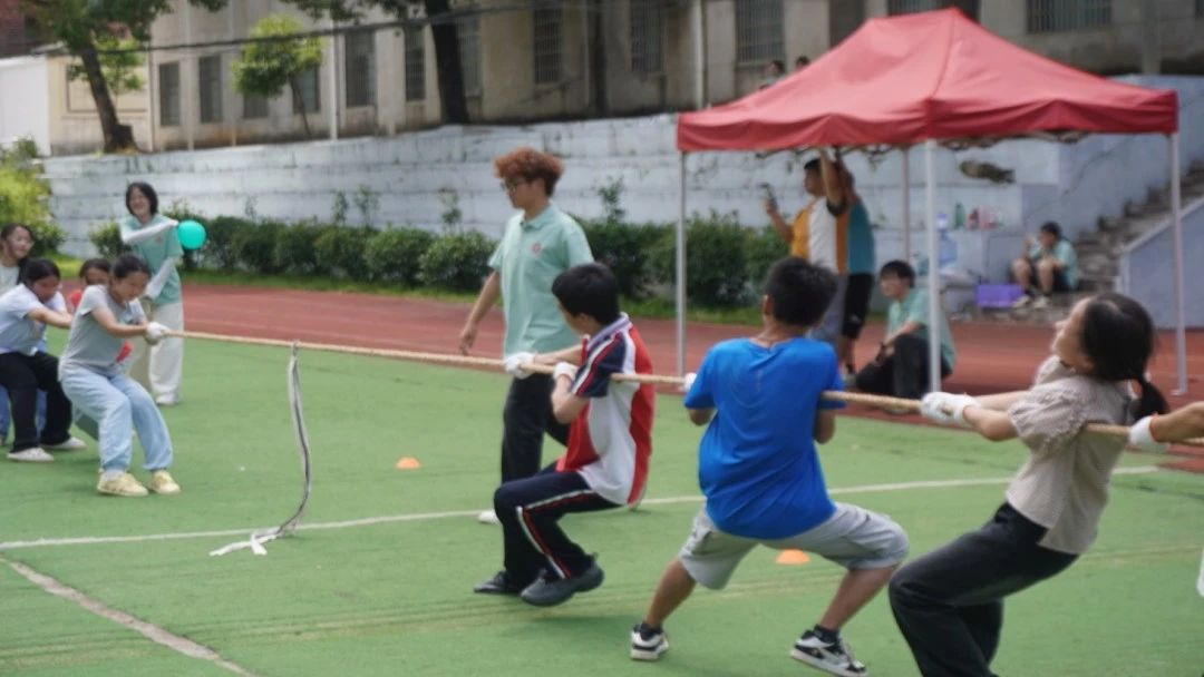 随着哨声响起,五项趣味项目轮番登场,赛场瞬间成为欢乐与拼搏的海洋。无论是需要灵活穿梭与接力配合的奔跑类项目,还是考验双人默契、共护 “西瓜” 的协作游戏,亦或是团队成员手递手传递、守护 “森林” 不倒的专注时刻,都让同学们在运动中体验着挑战的乐趣。飞盘在空中划出灵动弧线,是力量与精准的展现;拔河绳上的角力,是团结与坚持的较量。