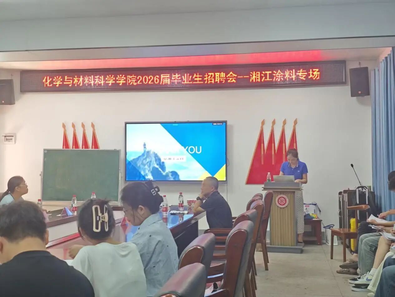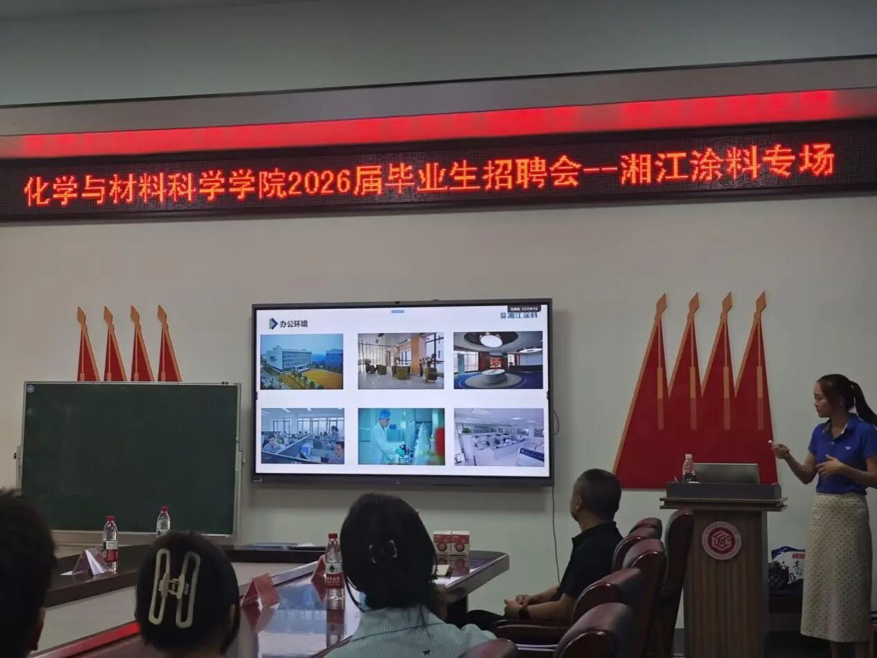为深化校企合作育人,精准助力我院2026届毕业生高质量就业,9月18日下午,我院特邀湘江涂料科技有限公司在化学楼105举办了专场招聘宣讲会。湘江涂料技术总监刘盛飞、人事经理华燕妮、成迎,院党总支副书记阳曼、副院长付伟伟、学工办主任唐升及2022级部分毕业生共同参与。