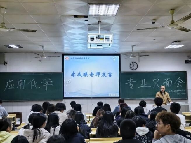 为帮助2025级应用化学专业学生深入洞悉专业内涵、明晰专业特色、把握专业前景,科学规划大学生涯,2025年10月23日晚19:30,我院在行知楼301举办了应用化学专业见面会。此次会议特邀倪文金老师和李成蹊老师担任主讲嘉宾,辅导员谢峥老师,班主任肖世兵老师和李忠良老师参会,2025级应用化学专业全体学生现场聆听。
