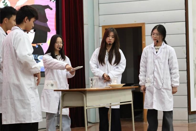 接着,“新生杯”化学科普情景剧大赛进入决赛环节,各参赛队伍巧思频出。他们将化学方程式与实验现象融入剧情演绎,让晦涩的有机反应、无机原理在舞台上直观鲜活呈现。其中《实验室里的隐身术》通过生动有趣的对话,科普了二氧化碳检验方法及生活中的酸碱小知识;《化学“魔法”实验室》通过展现日常生活中常见的神奇现象,科普了酸碱反应及溶解反应等化学知识;《蜡烛的秘密》通过探索蜡烛熄灭的秘密,生动形象地讲述了燃烧需要氧气这一科学小知识,这些表演引得全场师生连连喝彩。