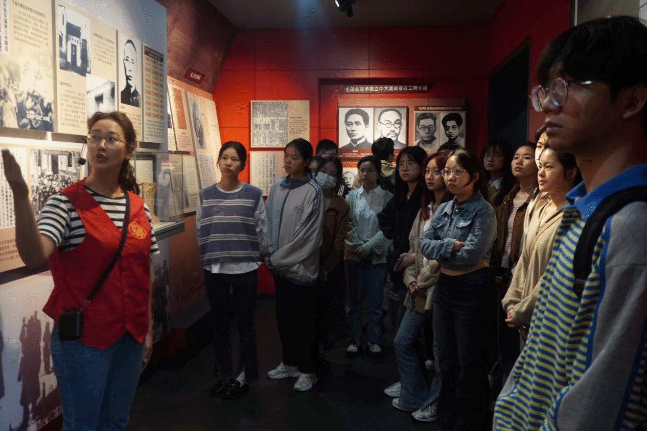 1921年10月,中国共产党诞生不久,毛泽东在夏明翰和贺恕的陪同下,到衡阳播撒革命火种,1922年4月底5月初,湘南第一党支部在湖南三师诞生,因此湖南三师被誉为“湘南革命摇篮”。在瞻仰陈列馆前的“蒋先云烈士纪念碑”后,在讲解员的带领下,同学们纷纷进入陈列馆,一同重温那段峥嵘岁月,回顾党走过的艰苦历程。三师师生中,尤为有影响力的当属张秋人和蒋先云。1922年8月,先辈张秋人以英文教师身份为掩护,在三师传播马克思主义先进思想,领导驱逐反动校长刘志远运动,惊动全省。学生蒋先云为保护学校和师生安全组织同学们开展护校运动,阻止军阀枪兵驻校的先进事迹诠释着一名优秀共产党人的初心使命。不仅如此,夏明翰、贺恕等先辈们的爱国行动激励着我辈青年“为什么要奋斗”“该如何奋斗”。