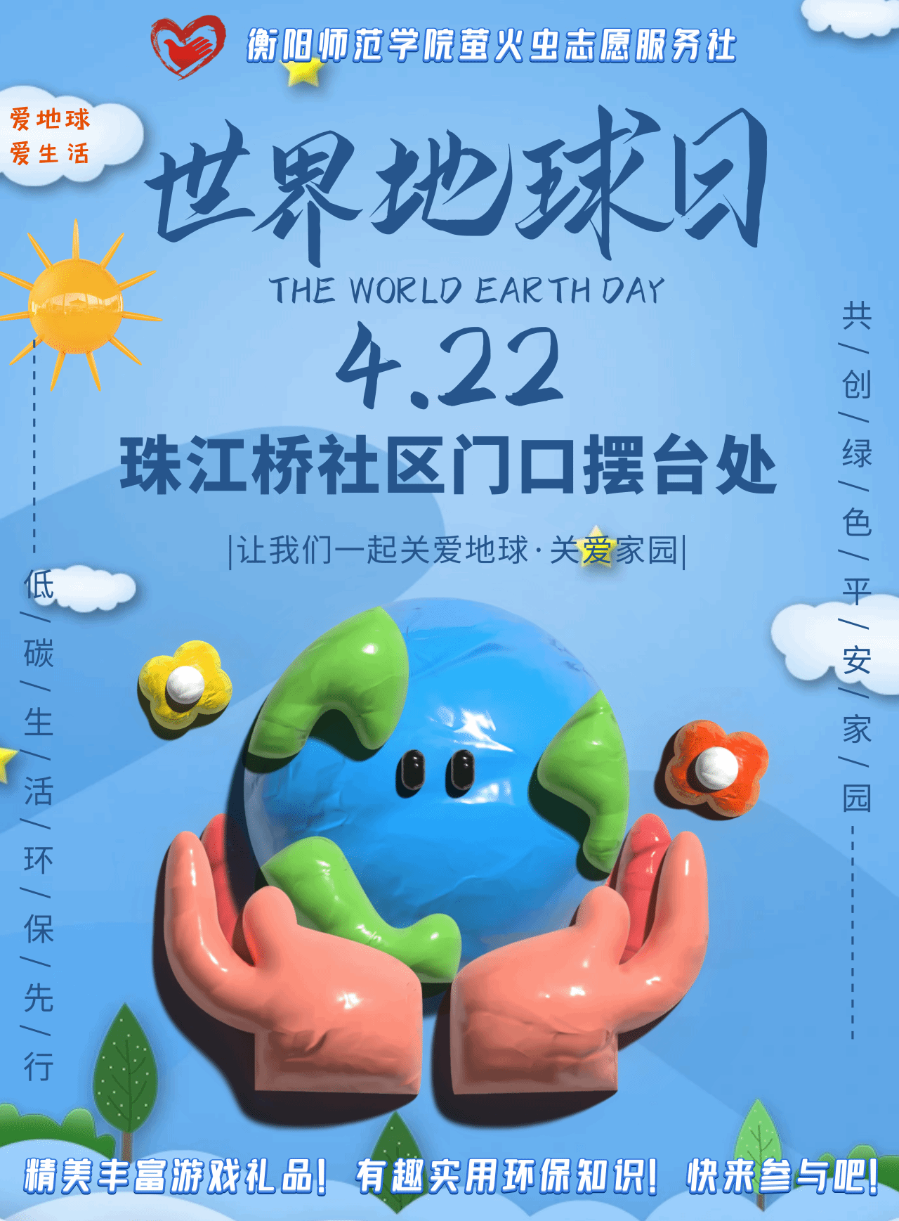 今天是4月22日世界地球日,为了动员广大群众积极践行“低碳生活,环保先行”的理念,持续推动绿色家园的创建,伟德BV1946化材学院萤火虫志愿服务社于衡阳市雁峰区珠江桥社区前坪举办了“保护地球:环保科普宣传进社区”志愿服务活动。