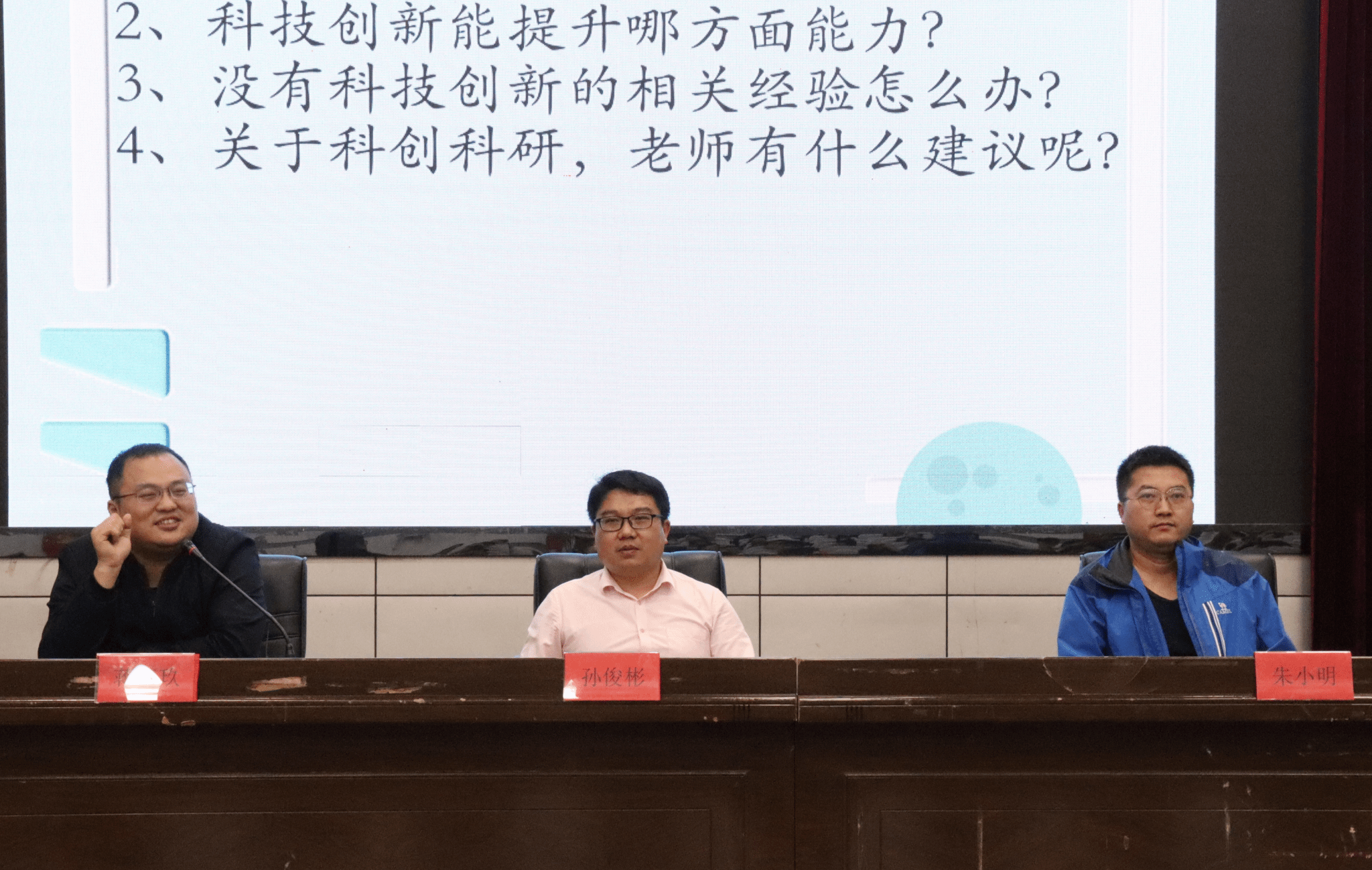 在科创优秀代表发言环节,李嘉鸿、唐怡、尹鑫三位具有丰富科技创新竞赛经历的学生代表分享了他们的科创经验与感受。学生代表李嘉鸿表示:“国与国竞争日趋激烈,科技创新正在成为大国博弈的主战杨,它对于我国实现现代化、实现中华民族的伟大复兴尤其重要。”在老师答疑过程中,孙俊彬、朱小明和蒋伍玖三位老师轮流回答了会前从学生中收集上来的四个普遍存在的疑惑问题。老师们回答认真严谨、细致耐心而又不失幽默,让同学们在轻松的氛围中受益匪浅、收获良多,也坚定了参与科技创新的决心。