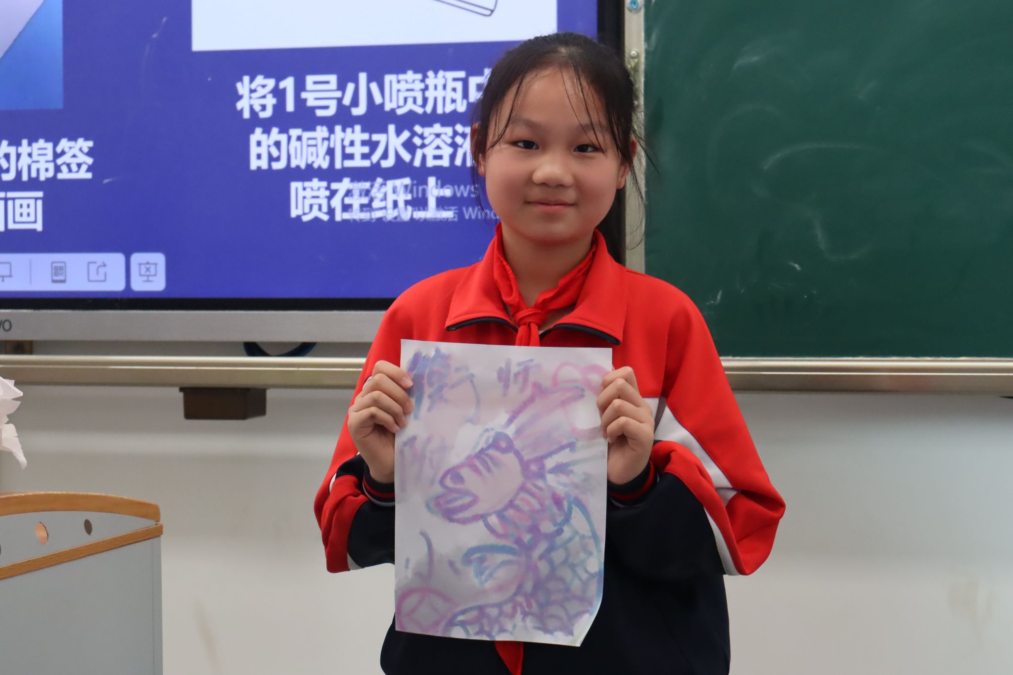 “大家喜欢化学魔术吗?”,志愿者肖峻彬用“化学魔术”一词激发了小学生们的课堂兴趣。紧接着,志愿者邓煦给一朵白色纸花喷上透明的“魔法药水”后,“白花”瞬间变成了“红花”,这一现象令小学生们兴奋不已。志愿者趁热打铁,在白纸上又喷上“魔法药水”,一条生动可爱的红色小神龙便跃出纸面。为了满足孩子们的好奇心,志愿者们便让孩子们分组一起参与趣味科学实验《召唤神龙》。“首先,拿起一根棉签蘸取1号‘魔法药水’在白纸上画上神龙图案。然后……。”经过志愿者们的耐心指导,孩子们在白纸上召唤出了自己的神龙。“这是为什么呢?”孩子们一个个好奇地询问。原来,这是酸碱指示剂的神奇作用,志愿者对实验的科学原理进行了解释,孩子们这才恍然大悟。活动的尾声,志愿者们给孩子们分发了在实验室自制的手工皂作为小奖品,激励孩子们要努力学好科学,用科学改变生活,用科学创造未来。下课铃声响起,孩子们却迟迟没有离开教室,他们一个个围绕着讲台,认真地询问各种问题,并表示十分期待下次上课的内容。