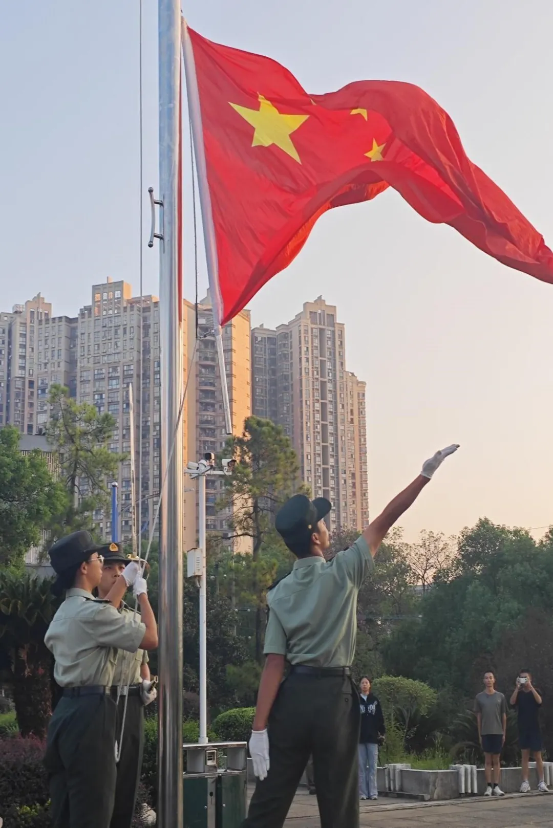 “护迎国旗!”教导队成员们以整齐划一、稳健有力的步伐步入会场,他们的眼神中透露出坚毅与决心。在同学们的热切注视下,他们庄严地将国旗护送至升旗台,彰显了对国家无尽的忠诚与热爱。国歌奏响,鲜艳的五星红旗伴随着雄壮的义勇军进行曲冉冉升起,在这庄严的时刻,全体学生肃立,齐声高唱国歌,并向国旗行注目礼,红旗沐浴着朝阳,飘扬在新世纪时代广场的上空,这一刻庄严而神圣,爱国之情在每一个同学心中澎湃激荡。