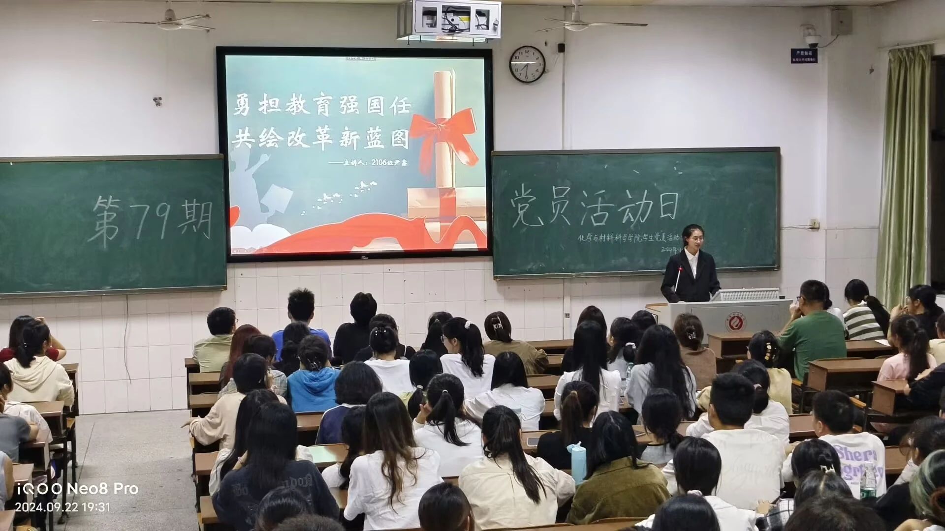 2024年9月22日晚,我院第七十九期“党员活动日”讲座在行知楼601进行,2106班尹鑫同学以《勇担教育强国任,共绘改革新蓝图》为题与全体学生党员和入党积极分子分享了她的学习心得。