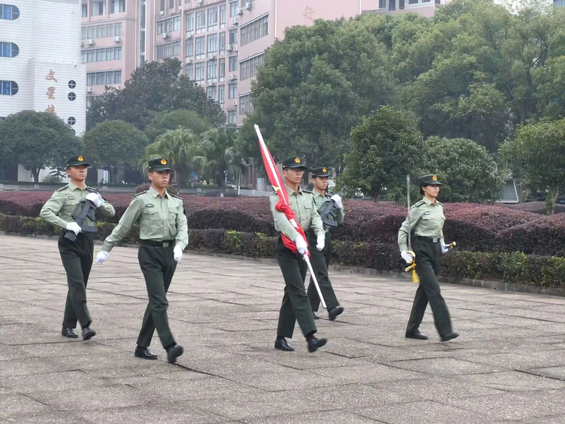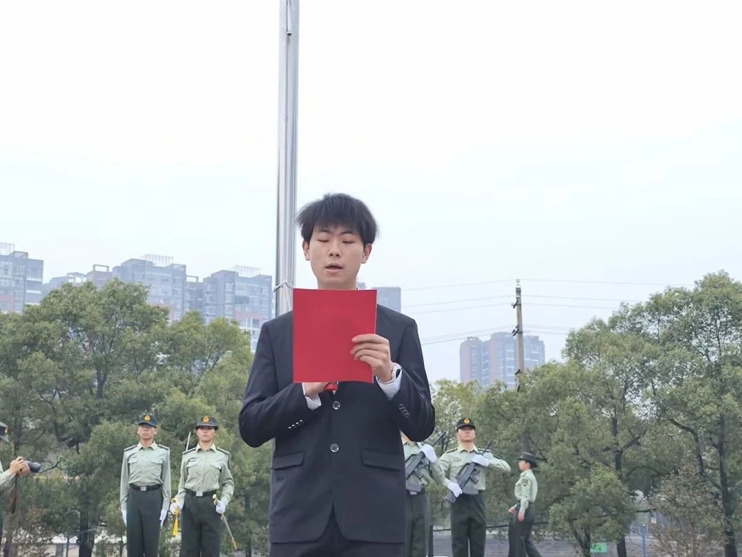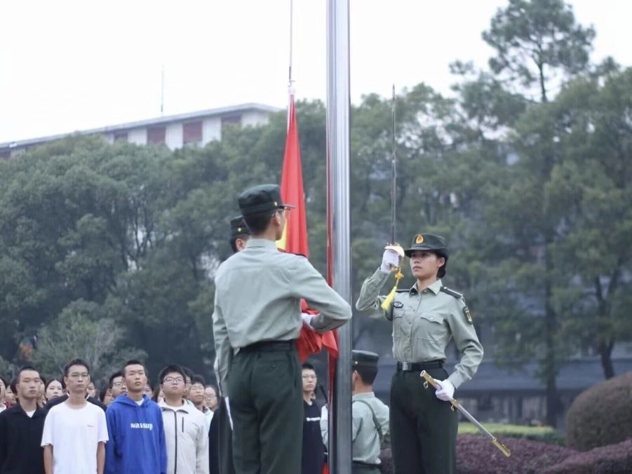 晨曦初破,各队列已于新世纪广场集合完毕。教导队成员们迈着稳健有力的步伐将神圣的五星红旗护送至升旗台。全体成员庄严肃立、行注目礼、奏唱国歌,五星红旗在微风中缓缓升起,迎风飘扬,学生们对祖国的深情厚爱与崇高敬意自然而然地涌现出来。