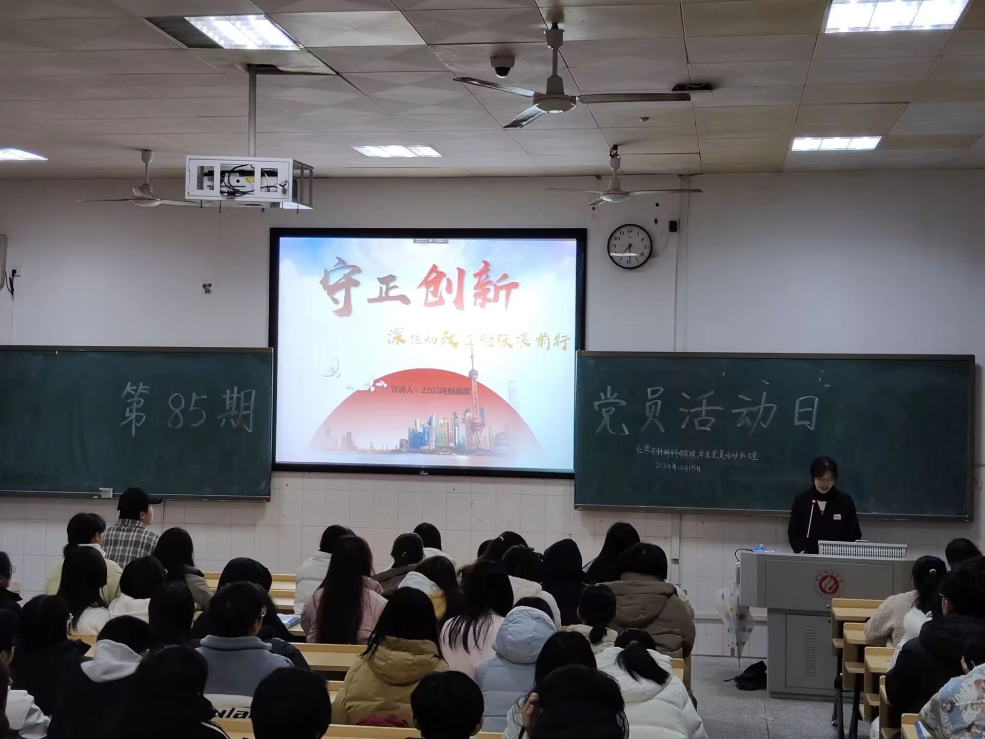 2024年12月15日晚,1946伟德国际源自英国第八十五期党员学习日活动于行知楼601开展,2205班杨琳琪同学以《“守正创新”推动深改巨轮“乘风破浪”》为题与全体学生党员和学习积极分子分享了她的学习心得。