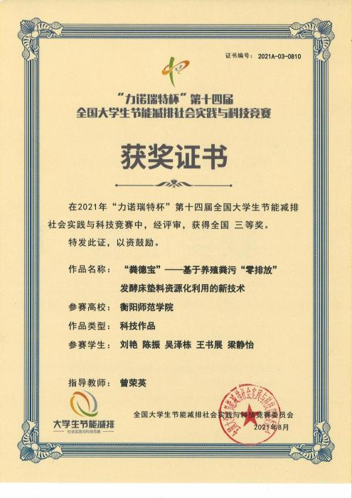 2021年8月28日,“力诺瑞特杯”第十四届全国大学生节能减排社会实践与科技竞赛落下帷幕。由我院曾荣英、唐文清博士指导、“光明科技创新团队”的刘艳、陈振、吴泽栋、王书展、梁静怡五位学生共同设计完成的《“粪德宝”——基于养殖粪污“零排放”发酵床垫料资源化利用的新技术》项目荣获三等奖。